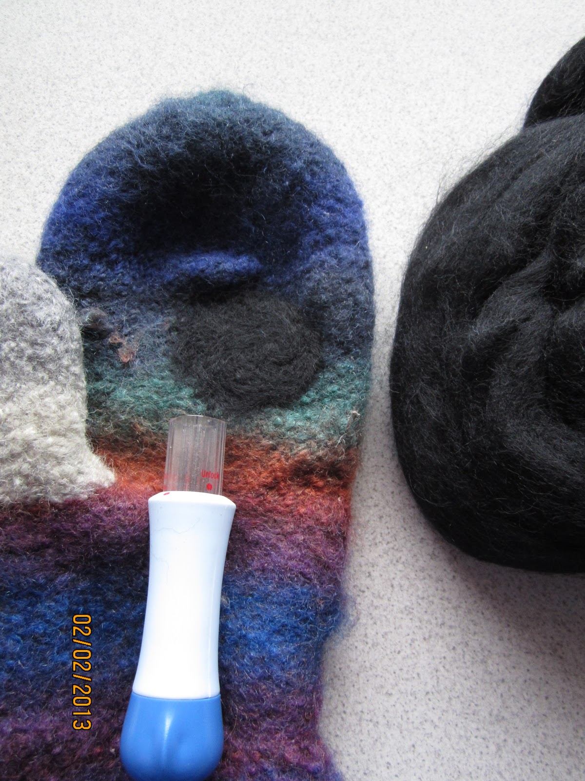 Katsoin Liv kanavan ohjelmaa Kirstien värkkäilyt. Siinä tehtiin neulahuovutusta ja sivulauseessa sanottiin että tätä tekniikkaa voisi käyttää parsimisen sijaan. Ja minähän heti kokeilemaan ja TOIMII. Tässä huopalapasessa ollut reikä on "parsittu" neulahuovutuksella.